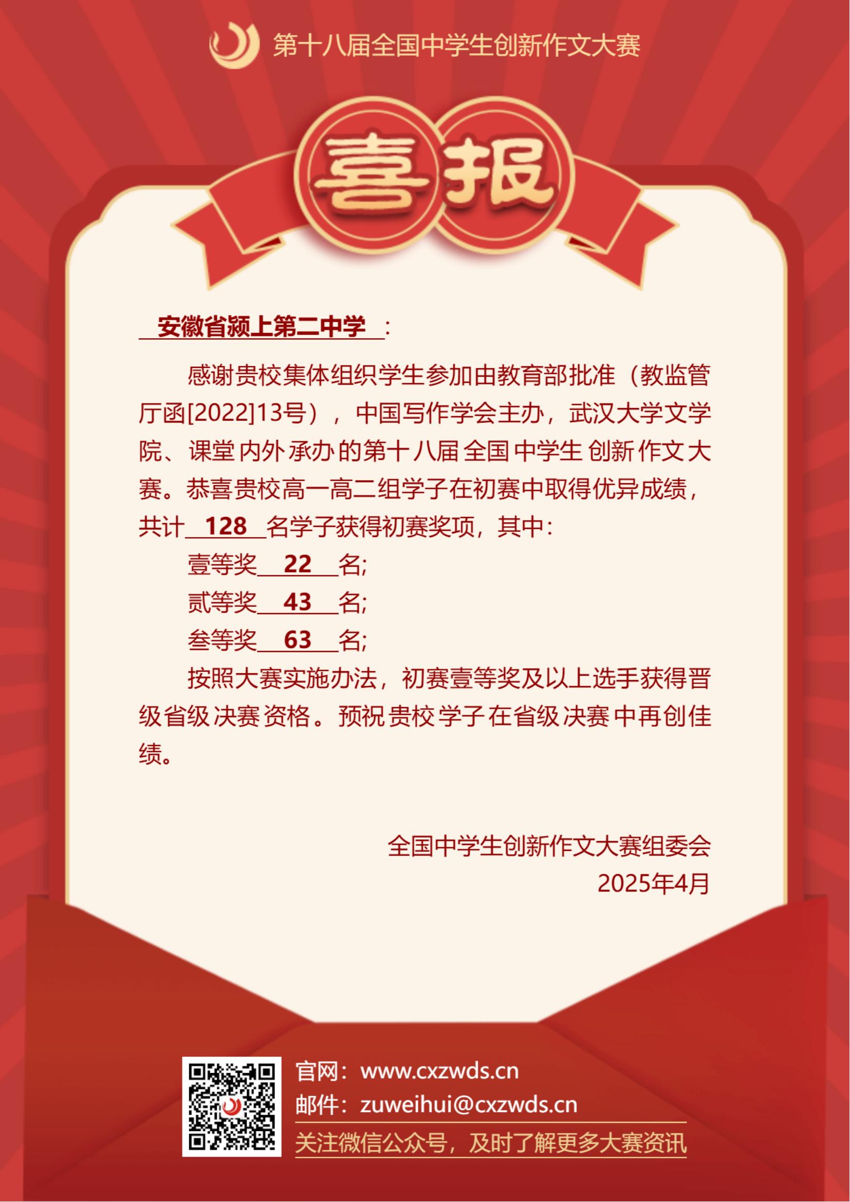 目前,晋级的学生们正在积极备赛,争取在省级决赛中再创佳绩,为学校争光。全国中学生创新作文大赛组委会也对颍上二中的学子送上了诚挚的祝福,期待他们在后续比赛中取得更优异的成绩。(供稿:叶波 审核:彭俊山 朱超)