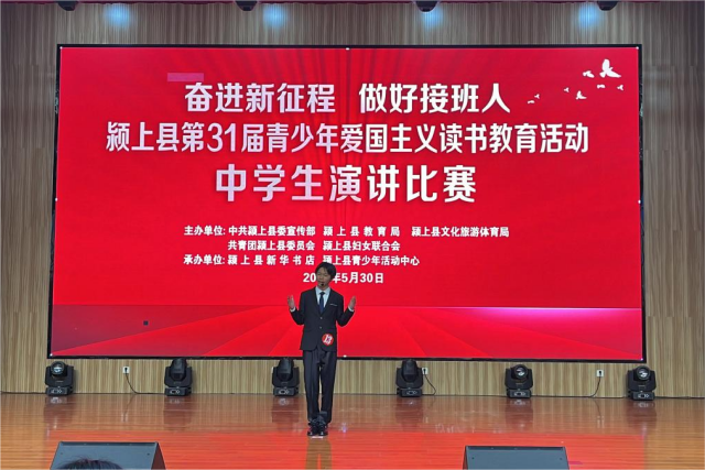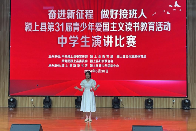 2024年5月30日,由中共颍上县委宣传部、颍上县教育局、颍上县文化旅游体育局、共青团颍上县委员会、颍上县妇女联合会主办,县青少年活动中心和新华书店承办的“奋进新征程,做好接班人”颍上县第31届青少年爱国主义读书教育活动中学生演讲比赛在县青少年活动中心举行。