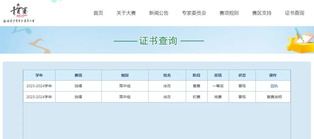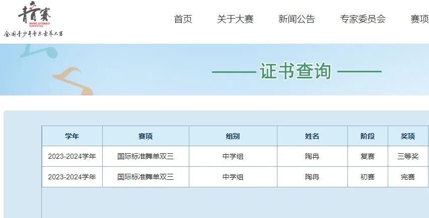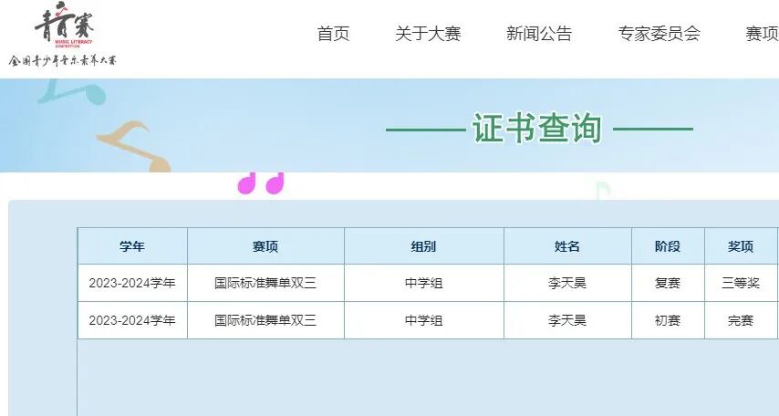 喜报丨颍上二中徐孜、陶冉、李天昊同学在全国青少年音乐素养大赛复赛中获奖!徐孜晋级全国总决赛! 发布时间:2024-07-31 阅读:次 近期,在2023—2024学年全国青少年音乐素养大赛公布的复赛结果中,颍上二中音乐教师蒋辉指导的徐孜同学荣获安徽赛区一等奖,并晋级全国总决赛;陶冉、李天昊同学荣获安徽赛区三等奖。 全国总决赛将于8月4日至6日在山东省济南市举办!在此,预祝她比赛顺利! 据悉,全国青少年音乐素养大赛由中国音乐文学学会主办,是教育部批准的面向中小学生的全国性竞赛活动之一,是艺术体育类中针对青少年音乐素养提升的全国性音乐赛事。 安徽赛区一等奖 安徽赛区三等奖 上一篇: 喜报丨颍上二中教师杨士景荣获第十三届阜阳市班主任基本功大赛高中组一等奖! 下一篇: 喜报|颍上二中学子在华人作文大赛中斩获佳绩