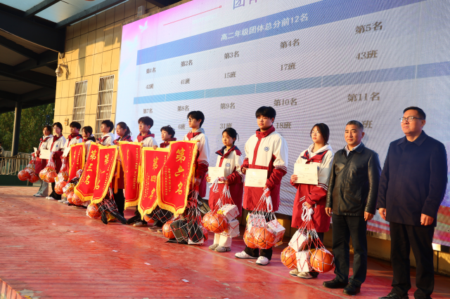 主持人宣读了各项获奖学生名单以及获奖班级名单。校党委书记朱超,校长石振华,副校长李涛、李鹏、常其征,校长助理张勇、李守宏、杜世宝,为获奖学生颁发奖牌、锦旗、荣誉证书以及奖品,并与获奖学生合影留念。