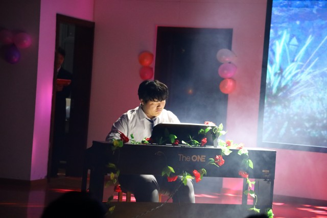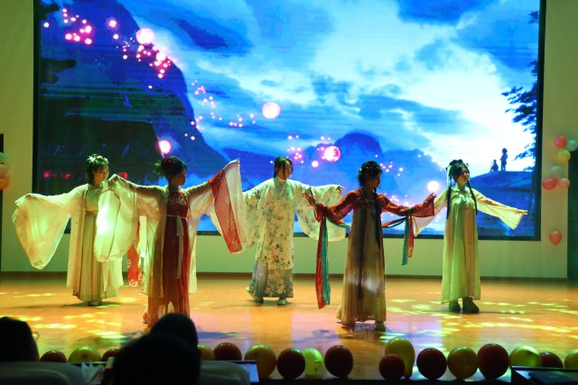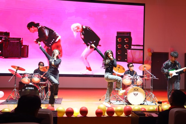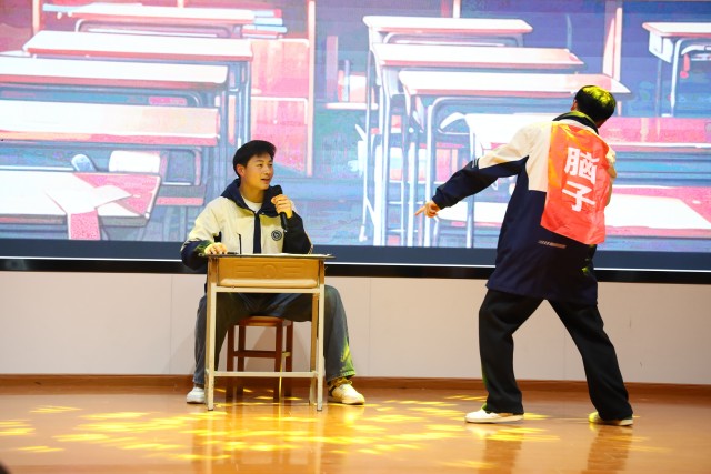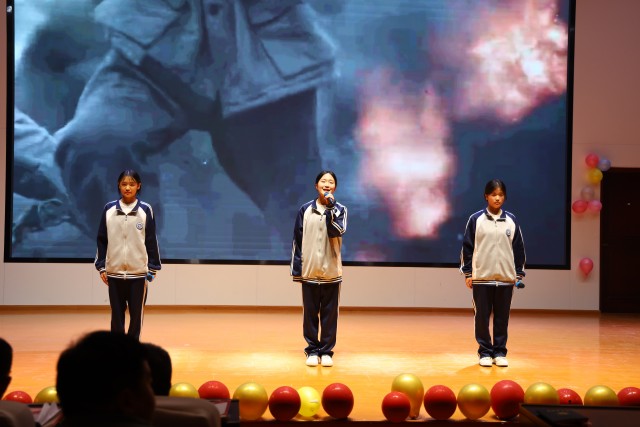 随后,精彩的节目轮番上演。曹凯歌、郭希旺、陶林语带来的架子鼓表演《激情打击乐》率先点燃现场气氛,激昂的鼓声如澎湃的浪潮,瞬间将观众带入充满活力的音乐世界,赢得阵阵掌声。王奥深情演绎的歌曲《光年之外》,用动人的嗓音诉说着跨越时空的爱恋,让观众沉浸在浪漫的音乐氛围中。朗诵《月光下的中国》《放飞中国梦》,或深情婉转,或慷慨激昂,同学们用真挚的情感表达了对祖国的热爱与赞美,展现出新时代青年的担当与追求。