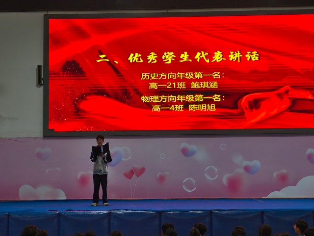 大会在雄壮而庄严的国歌声中拉开帷幕。高一(21)班鲍琪涵、高一(4)班陈明旭两名优秀学生代表就理科、文科学习进行了经验分享,把自己在学习过程中的感悟和方法带给大家,号召所有同学珍惜时间,做好合理规划,提高学习效率。他们用质朴的语言和真挚的情感,激励着同学们奋勇向前。