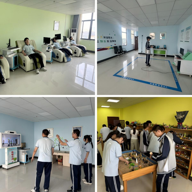 讲座结束后,部分学生代表在李烺及刘慧慧老师的带领下参与了心理游园活动。在学校心理咨询室,同学们参观并体验了VR心理训练、沙盘游戏、体感互动、音乐放松等专业设备。通过沉浸式体验,学生们在趣味活动中释放压力、放松身心,进一步提升了对心理健康的认知和关注。