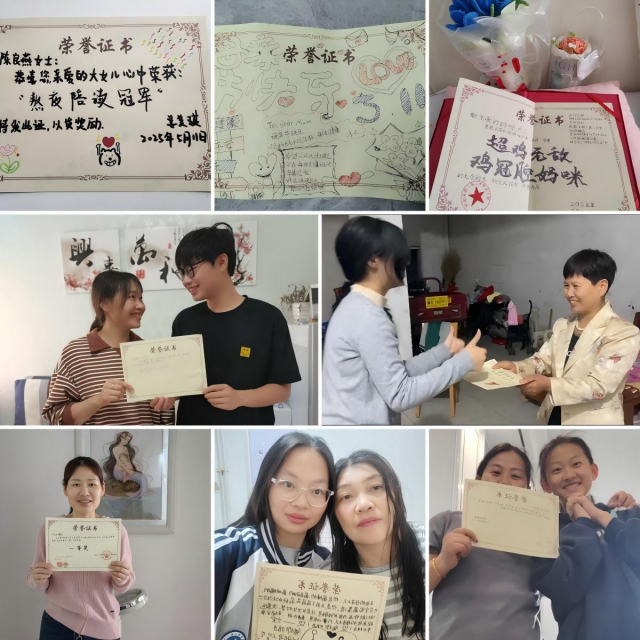 值得关注的是,颍上二中始终将家校协同育人作为心理健康教育的重要环节。在母亲节来临时,特别开展“我为妈妈颁个奖”主题活动。学生们通过为母亲撰写颁奖词、制作手工贺卡、录制感恩视频等形式,向母亲表达感激之情,在亲子互动中增进理解与沟通。这一活动不仅引导学生学会感恩、理解亲情,更通过家庭场景中的心理互动,助力构建和谐亲子关系,为学生的心理健康成长营造了良好的家庭氛围。
