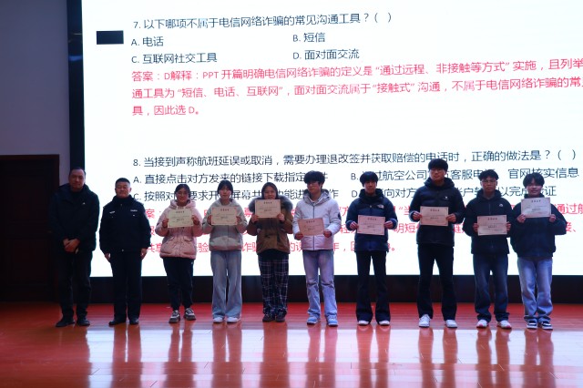 互动环节中,同学们踊跃回答提问,现场气氛热烈。学校为积极参与互动的同学颁发了荣誉证书并合影留念。此次报告会内容丰富、干货满满,既有法律知识普及,又有实操技巧指导,让同学们对诈骗手段有了更清晰的认识,有效提升了自我保护能力。