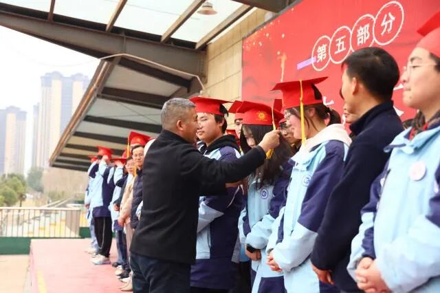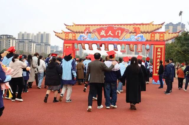 驶流光其冉冉,随春水其汤汤。43位学生代表奔向舞台,由班主任为他们戴上成人礼帽,并由校党委书记、校长朱超给他们正冠拨穗。追光少年鸿鹄志,十八而志启新程。成人冠礼,不仅仅是对自我的肯定,也是对父母、对老师的感恩,更是对社会、对祖国的一份责任。
