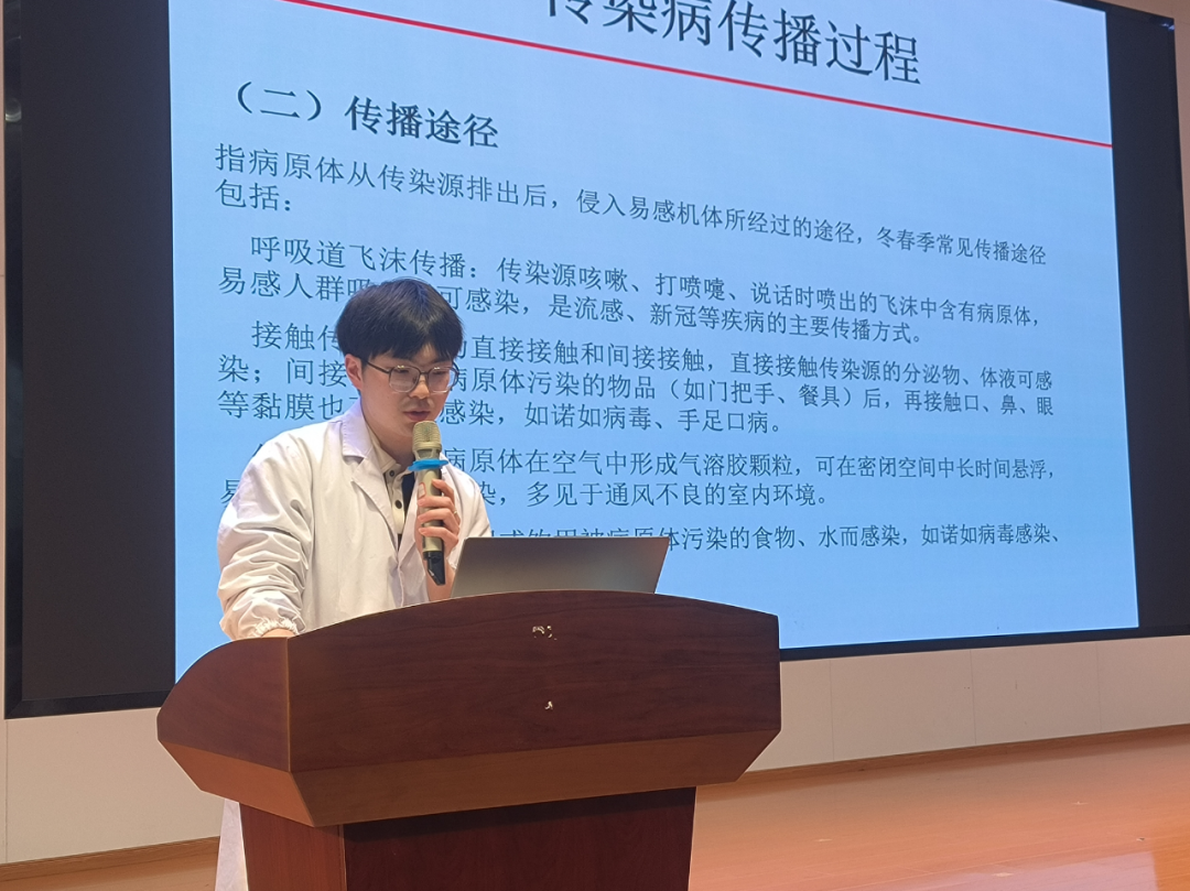 彭伟作总结讲话。他对赵文涛医师的专业讲解表示感谢,强调本次讲座旨在培养班级防疫工作的“宣传员” 和 “监督员”,要求各位学生骨干认真消化讲座内容,将所学的防疫知识和方法运用到日常班级工作中,一方面做好班级晨检、通风消毒等基础防疫工作,及时发现并上报同学的身体异常情况;另一方面主动向班级同学普及传染病预防知识,引导身边同学养成勤洗手、戴口罩、常通风的良好卫生习惯,加强体育锻炼提升免疫力。