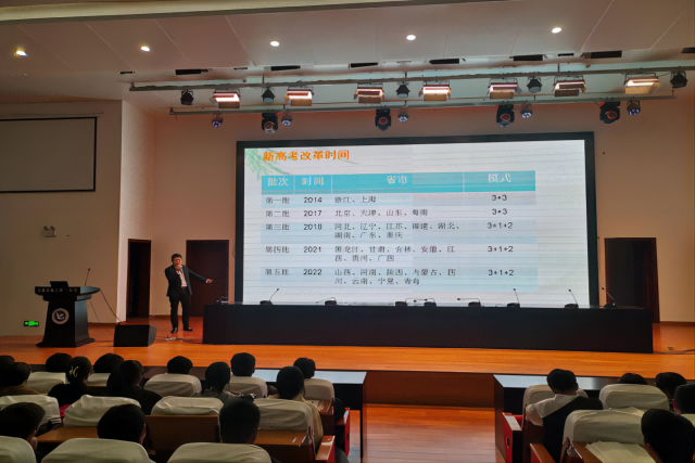 为帮助高一年级新生更好地适应高中生活,了解新高考相关政策与“3+1+2”选科模式,进一步引导学生规划高中生涯,更好地迎接新高考带来的挑战,2023年9月25至27日,颍上二中高一年级利用自习时间,连续三天分批次地在行政楼东报告厅举行了以“‘预见’方能‘遇见’”为主题的集体班会。高一年级主任蔡俊杰,副主任崔猛、王乐潇、张泽,全体班主任及高一新生参加,会议由樊涛林老师主持。