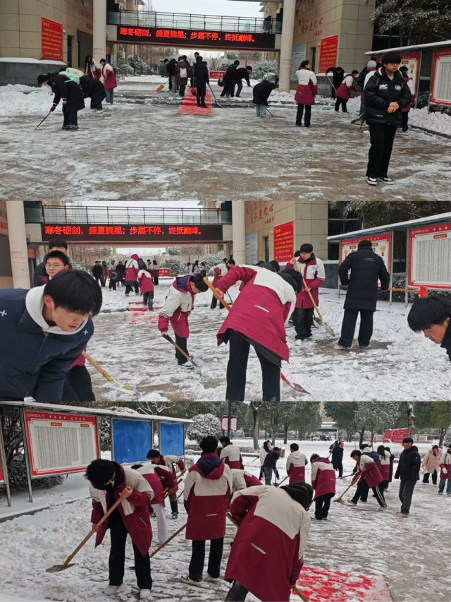 风雪虽寒,人心炽热;领导带头,师生齐心。本次铲雪行动,高三师生用最短时间、最高效率保障了全校师生的通行安全,也在紧张的备考节奏中,谱写了一曲劳动与奉献的青春插曲。他们铲除的是积雪,展现的是风貌,温暖的不仅是道路,更是整个校园。这份冬日里的暖流与担当,必将化为他们迎战高考、迈向未来的坚实力量!(供稿:秦洪菊 审核:叶波 彭俊山 朱超)