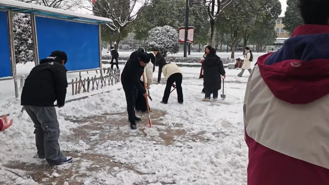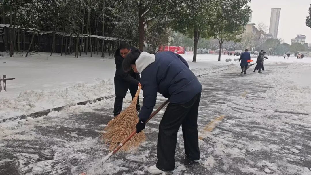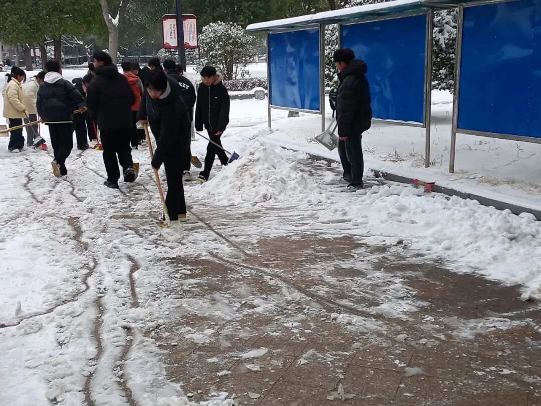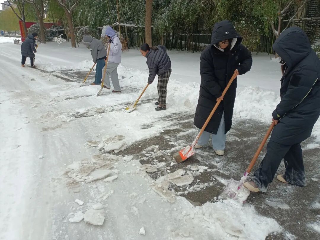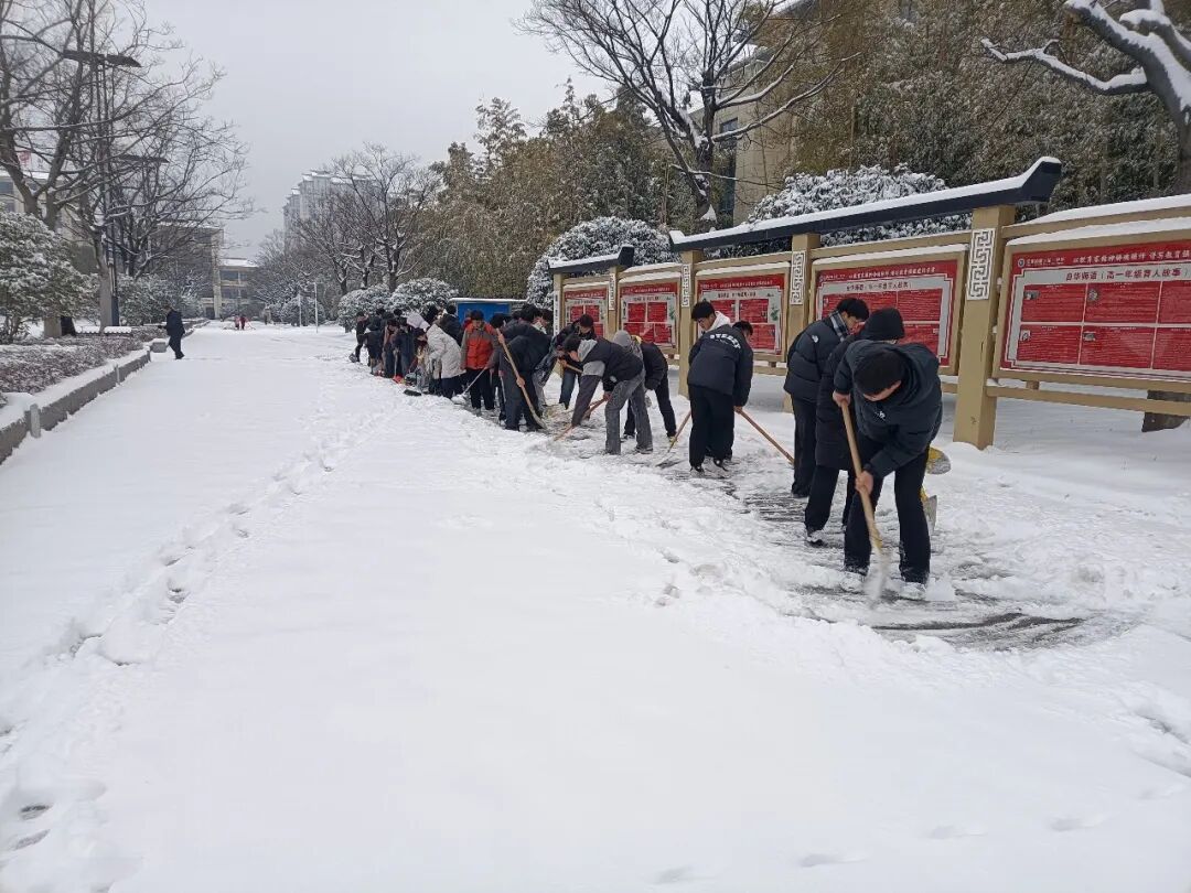 在这次行动中,师生们展现出了高度的责任感和团结协作精神。由于天气寒冷,地面上不仅存雪量大且冰冻凝固,坚硬无比,给除雪铲冰带来了很大难度。大家不畏严寒,默契配合,或铲、或扫、或推,想尽各种办法破冰除雪,忙碌的身影筑成冰雪中的亮丽风景。经过1个多小时的奋战,主干道的积雪积冰基本清理完毕,师生们用实际行动清扫出了一条条迎接师生顺利回归的“平安路”。