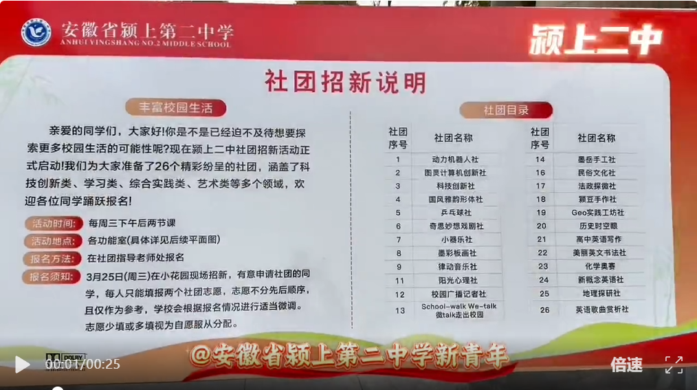 3月25日下午,颍上二中2025-2026学年第二学期社团招新活动圆满结束,26个特色社团顺利完成纳新,为高一新生的校园生活翻开崭新篇章。