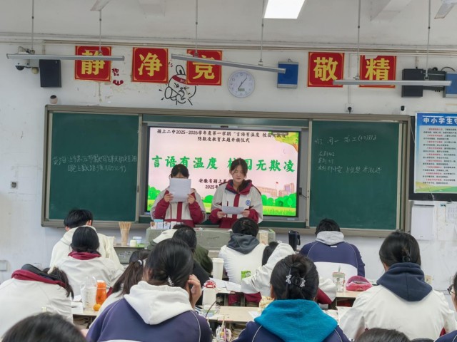 为筑牢校园安全防线,弘扬文明友善之风,引导全体学子树立尊重他人、拒绝欺凌的意识,11月3日上午7点,颍上二中在校园广播站举行了“言语有温度 校园无欺凌”主题升旗仪式。
