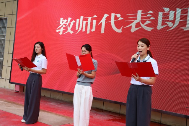 师者仁心传薪火,声情并茂诉担当。在师生共同期待中,高一杨燕、高二李慧、高三张义能三位老师代表年级携手登台,带来朗诵《铭记历史 逐梦未来》。老师们的声音时而深沉激昂,回溯先辈“烽火中挺立的脊梁”;时而温柔恳切,寄语学子“把奋斗的种子埋进心田”。他们用饱含深情的话语,将历史精神与教育初心相融合,既提醒同学们“历史从未远离,精神血脉需传承”,也承诺将以三尺讲台为阵地,陪伴学子在求知路上坚定前行,让红色基因在教学相长中代代延续。