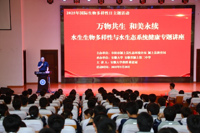 5月28日,由颍上县生态环境分局、颍上县教育局主办,颍上二中承办的“万物共生和美永续——水生生物多样性与水生态系统健康”讲座在颍上二中东报告厅举行。安徽大学蒋忠冠教授以专业视角解析生态保护,为颍上二中学生带来兼具深度与实践价值的分享。