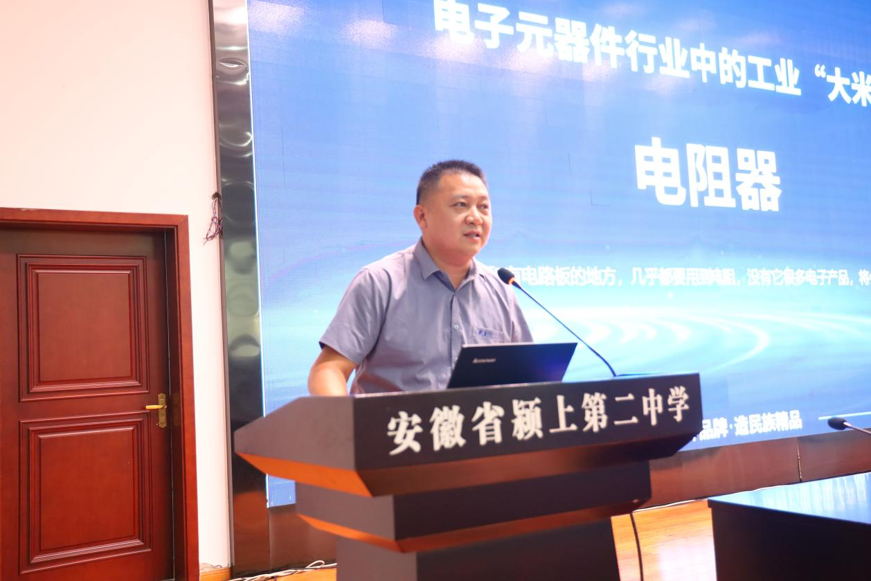 安徽翔胜科技有限公司总裁孙振结合自己从事电阻器行业二十多年生产以及销售工作经验,给同学们分享了电阻的生产技术和行业职业状况。他结合公司的运营和管理经验,给同学们提出职业生涯规划建议。他鼓励刚进入高一校园的同学们不忘梦想与目标,坚定努力。
