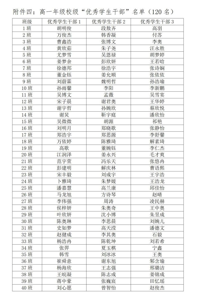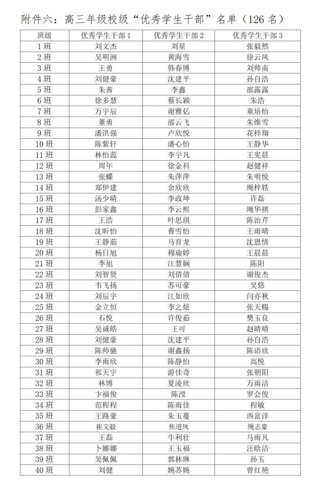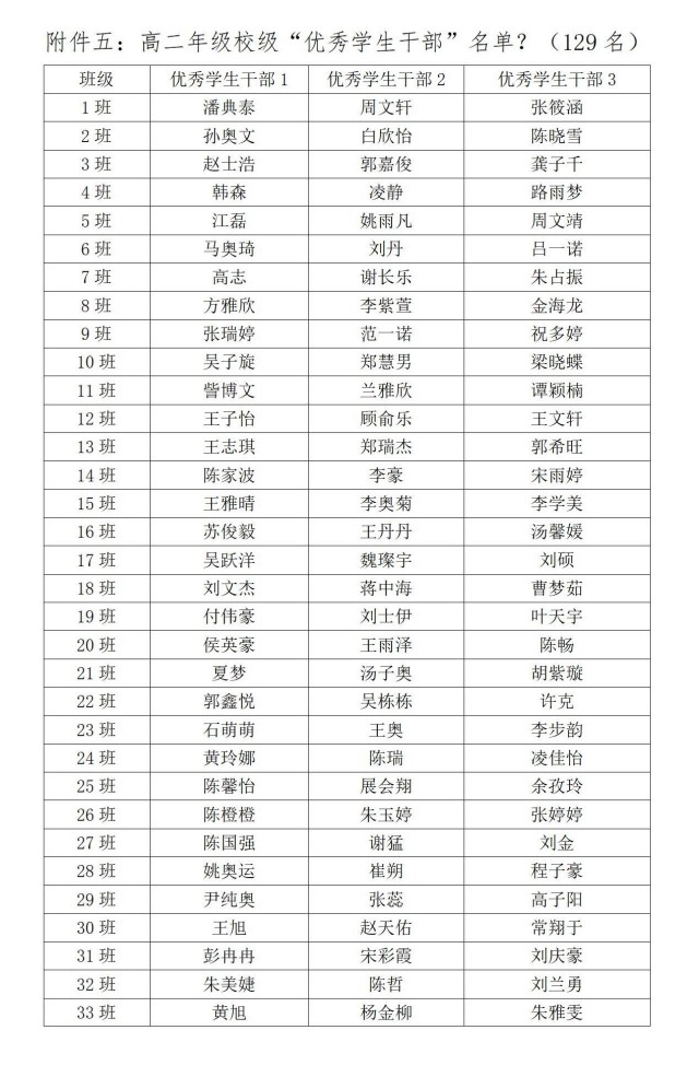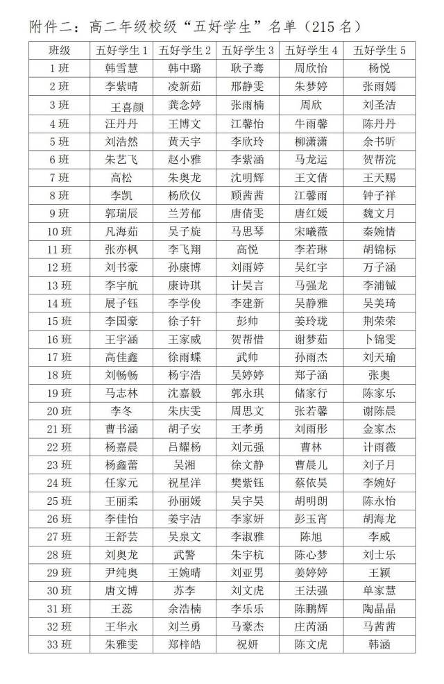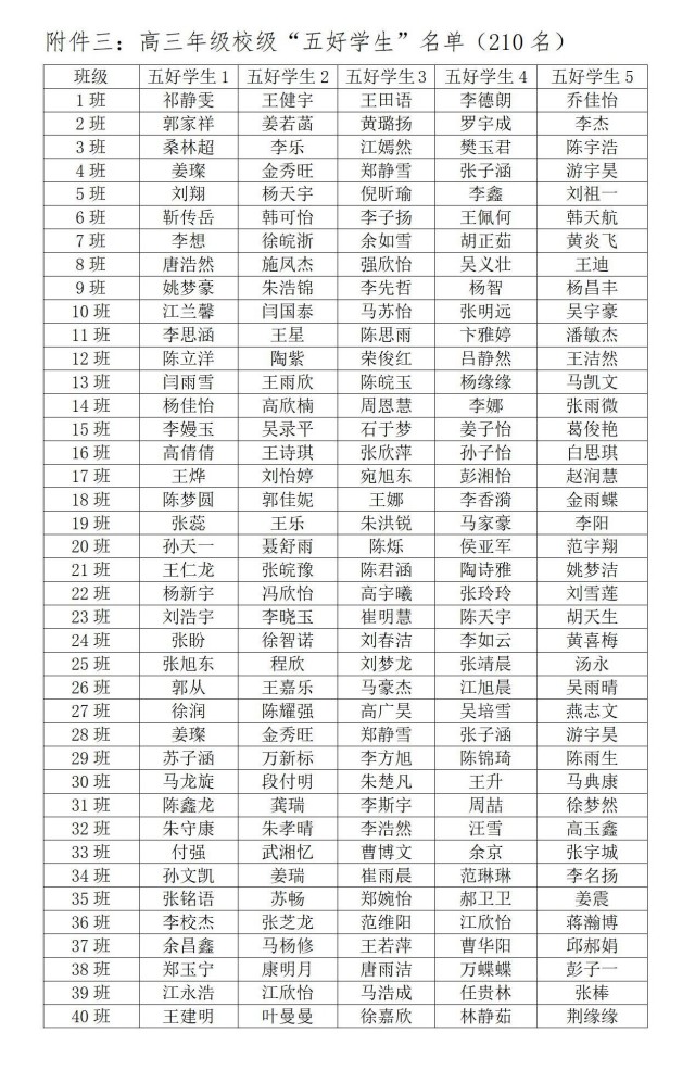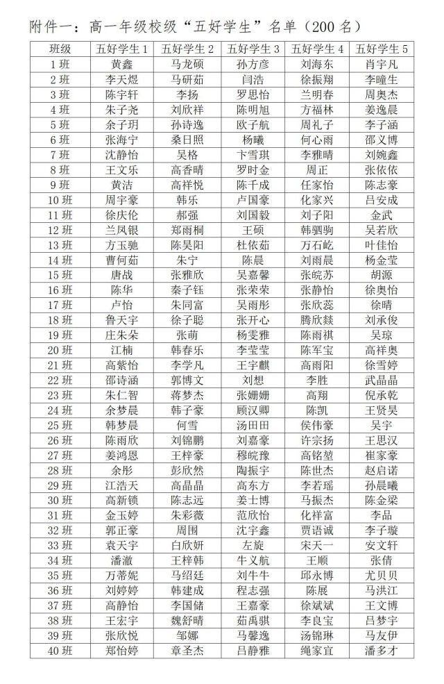 2024-2025学年第一学期,在颍上二中党委、校长室的领导和学校全体老师的共同努力下,我校学生工作扎实推进,取得了长足的进步。全校学生坚定理想信念,刻苦学习,积极进取,在德、智、体、美、劳等方面都取得了优异成绩。为表彰先进,树立典型,发挥先进的模范带头作用,进一步推动我校高质量发展,本着“公开、公平、公正”的原则,经各年级推荐,政教处严格评审,学校决定授予高一(1)班黄鑫、高二(1)班韩雪慧、高三(1)班祁静雯等625名同学校级“五好学生”的光荣称号,授予高一(1)班胡明俊、高二(1)班潘典泰、高三(1)班刘文杰等375名同学校级“优秀学生干部”的光荣称号。