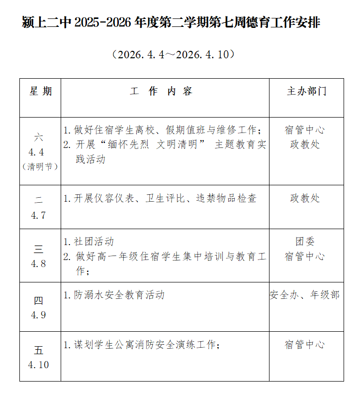颍上二中2025-2026年度第二学期第七周德育工作安排 发布时间:2026-04-03 阅读:次 上一篇: 颍上二中2025-2026年度第二学期第六周德育工作安排 下一篇: 颍上二中2025-2026年度第二学期第八周德育工作安排