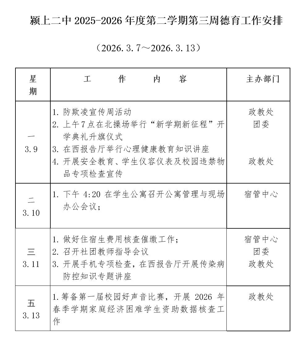 颍上二中2025-2026学年第二学期第3周德育工作安排 发布时间:2026-03-08 阅读:次 上一篇: 颍上二中2025-2026学年第二学期第1周德育工作安排 下一篇: 颍上二中关于表彰校级“五好学生”“优秀学生干部”的决定