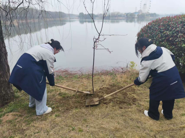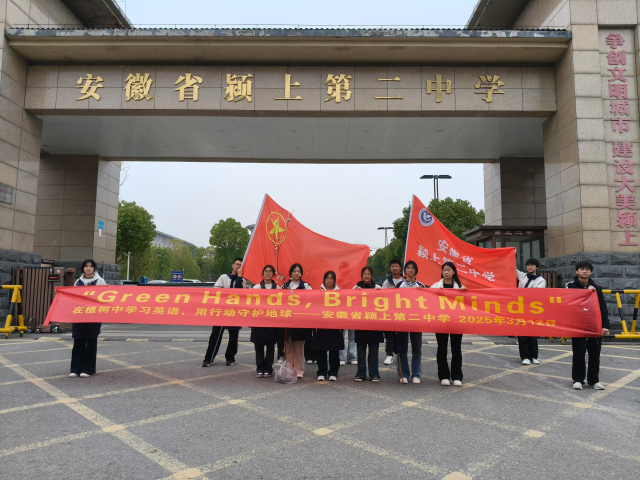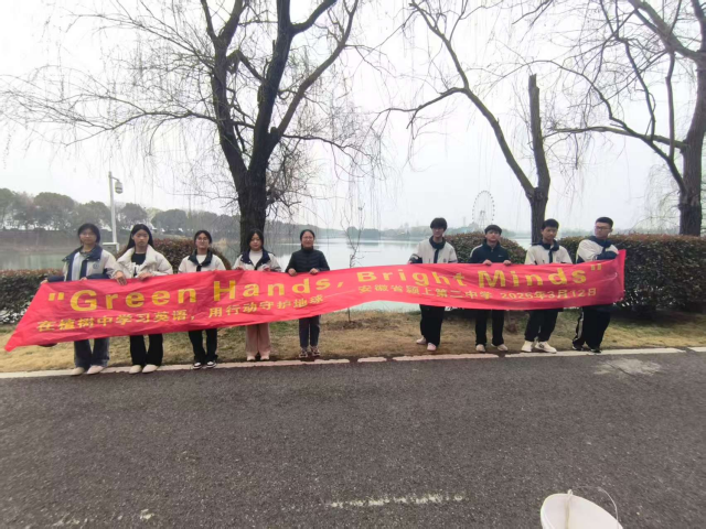 春意盎然,绿满人间。为积极响应植树节的号召,践行环保理念,3 月 12 日,在颍上二中团委的组织下,新概念英语社的指导老师张园园、钮庆婷带领社团成员,前往当地的八里河风景区,开展了以 “Green Hands, Bright Minds” 为主题的植树活动。此次活动巧妙地将英语学习与环保实践相结合,为春日增添了一抹盎然生机。