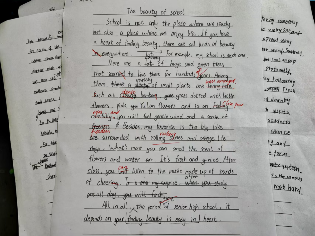 一行人最终来到了校园的小湖边,杨柳(willow)依依,新芽初露,芦苇(reeds)虽已枯黄,却依旧挺立,湖面如镜,倒映着蓝天白云与岸边的假山(rockery)。假山错落有致,与周围的景色相映成趣,仿佛一幅天然的水墨画(a natural ink painting)。在校园的西侧,诗华楼与书华楼前传来阵阵朗朗的读书声与欢笑声(echo with the sounds of reading and laughter),而在两楼旁边隐藏着颍上二中的“秘密基地”(secret base)——劳动实践基地(the labor practice base)。恰逢植树节(Arbor Day),许多学生正在这里挥锹培土(shovel soil and plant saplings),种下一棵棵希望的树苗,为地球增添一抹新绿,也为校园注入了勃勃生机。