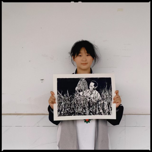 在这次社团活动中同学们围绕“劳动之光·美在奉献”主题要求,紧扣劳动主题,传递积极价值观,拒绝低俗或偏离主题的内容。作品展现了工人、农民、教师、医护人员、环卫工人等群体的精神风貌,体现了奋斗、奉献、团结协作、工匠精神等内涵。社员创作的作品《禾下匠心》以袁隆平院士在稻田中专注研究水稻苗的形象为核心,通过简洁有力的黑白对比和细腻的线条刻画,展现了科学家与农业的深刻联系。画面中稻穗与人物比例的微妙处理(如稻穗高于人物),象征其“禾下乘凉梦”的宏大愿景。作品既是对个体形象的写实记录,更是对“当代神农”精神的抽象升华,以黑白之力传递出跨越时空的敬意。