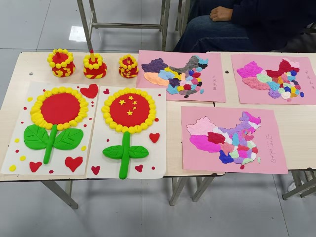 当社团老师现场播放2025年第76个国庆节升旗仪式的视频,雄壮的国歌响起时,全体学生自发起立跟唱,眼神坚定、歌声嘹亮,爱国情怀在歌声中深深扎根。在浓厚的氛围中,学生们分工协作,拿起黏土精心创作:有的勾勒华夏版图,用指尖的创意传递对祖国的热爱与美好祝愿;有的捏塑向日葵,朵朵向阳映祖国蓬勃生机。此外,学生们还在粘土作品上写下“国泰民安”“山河无恙”,一笔一画皆是对祖国的美好祈愿,其中更藏着少年对祖国强大的满心自豪。