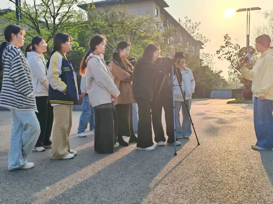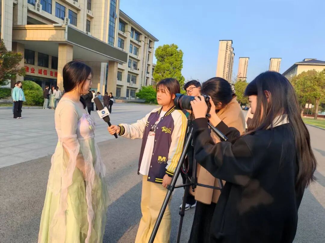 校园广播记者社的同学们全程跟进记录,以专业的视角完成了一场沉浸式采访实践。从前期策划、机位架设,到现场采访、镜头捕捉,记者社成员分工协作:摄像同学用三脚架稳定机位,精准捕捉舞蹈的每一个动人瞬间;采访同学手持话筒,对形体社成员、观演师生进行现场访谈,深入了解国风舞蹈的创作灵感、清明文化的理解感悟,以及校园文化活动的参与体验。大家在实践中锻炼了采访、摄像、沟通的综合能力,也用镜头语言记录下了校园文化的鲜活瞬间。