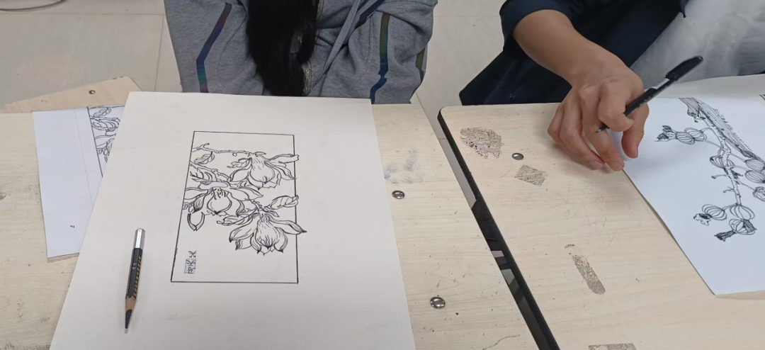 活动现场,案头繁花争艳,同学们屏息凝神,手持画笔专注创作。与以往不同,此次活动重点强调“线条的情绪与韵律”。从花瓣的旋转纹理到枝丫的伸展姿态,大家摒弃了色彩的干扰,只用单纯的线条去构建形体的体积感与空间感。