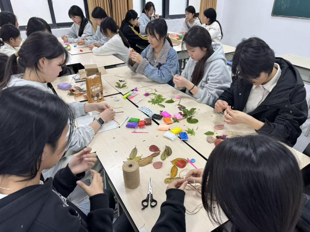 活动以“变废为宝,向美而生”为宗旨,分为“材料收集”“创意设计”“手工制作”三大环节。社团成员们早早行动起来:漫步校园小径,拾取校园落叶;从家里带来硬纸盒;再配以指导老师提前给大家准备好的彩色的粘土,一场自然与人工材料的奇妙对话就此展开。