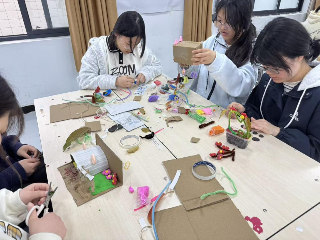 在成果展示阶段,同学之间的赞叹此起彼伏,“原来废弃的东西也能这么美!我要把家里的快递盒留着试试”“落叶和粘土搭配好有生命力,感觉春日美丽永远留在了纸盒上”……作品传递的不仅是视觉享受,更唤醒着同学们心中对环保的关注与热爱。