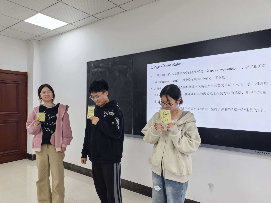 为进一步点燃学习热情,与手工制作相关的实用词汇如scissors(剪刀)、glue (胶水)、string(绳子)、tape(胶带)、stick (粘贴)、decorate(装饰)等和短语如stick with glue(用胶水粘贴)、fold the paper(折纸)、use scissors carefully(小心使用剪刀)等轮番上阵,紧张又好玩的单词Bingo游戏火热开启。同学们将所学单词随机填写在九宫格内,老师随机念词,全场屏息凝神、认真核对,率先连成一线的同学成功获胜,收获沙画小奖品,喜悦与成就感洋溢在每张青春脸庞上。随后,手工相关实用句子学习与翻译环节有序开展,如We have fun making fruit net crafts and learning English.(我们在制作水果网手工作品和学习英语的过程中很开心。) I use glue to stick the fruit net together. (我用胶水把水果网粘在一起。)等,多样形式反复巩固,让同学们在轻松氛围中提升英语应用能力。