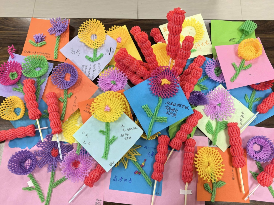 最动人的环节温暖上演。同学们在手工作品上认真写下祝福,将最真挚的鼓励送给即将踏上高考战场的高三学长学姐。愿他们如手中花朵,向阳绽放、绚烂夺目;如串串糖葫芦,苦尽甘来、圆满顺遂,带着满心期许奔赴理想远方。一份份小巧手作,一句句暖心寄语,承载着学弟学妹的美好祝愿,也为紧张备考的高三学子送去满满力量与温暖。
